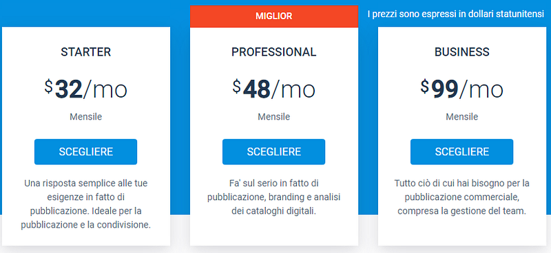 Flipsnack offers a “starter”, a “professional” and a “business” plan. That starter which is the cheapest costs 32 dollars a month, and also has the limit of being able to create a maximum of 10 catalogs each of a maximum of 100 pages (or 100MB of weight).