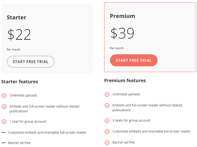 ISUU is also on the same line as FlipSnack considering that it offers the basic plan for a good $22 a month, which in any case always features the ISUU banner ad.