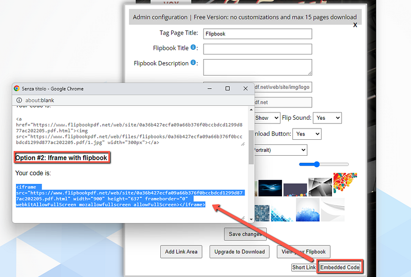 Click on Embedded Code button and then copy the code (from OPTION #2) as shown in the figure above. This code will be used to add the Flipbook on your Shopify store.